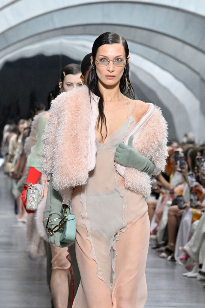 Cependant, deux moments ont particulièrement attiré l’attention : le comeback de Bella Hadid et l’ouverture du défilé par une mannequin enceinte, un geste aussi fort qu’inattendu.